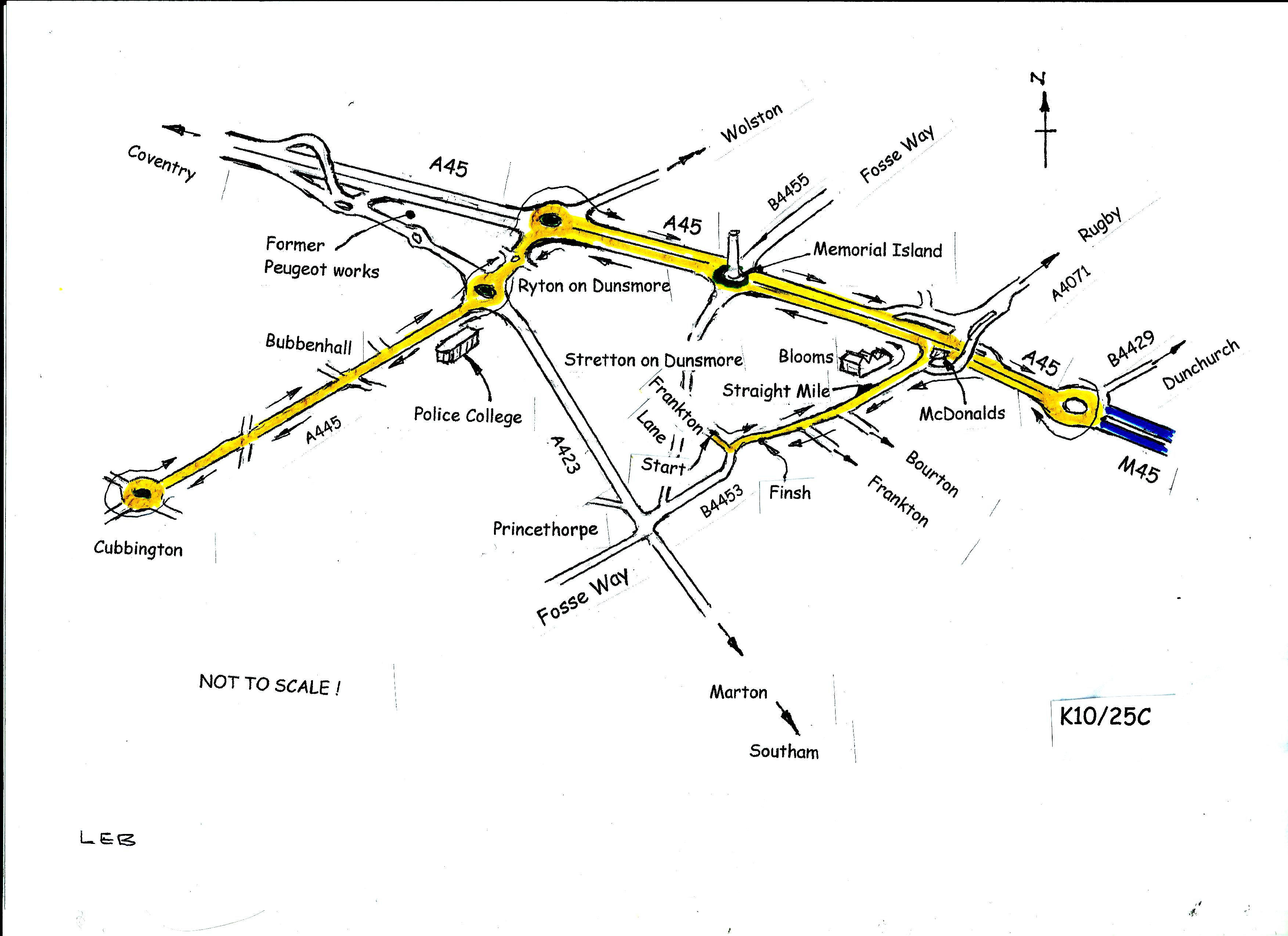 At M45 island at Thurlaston encircle island and retrace along A45. |